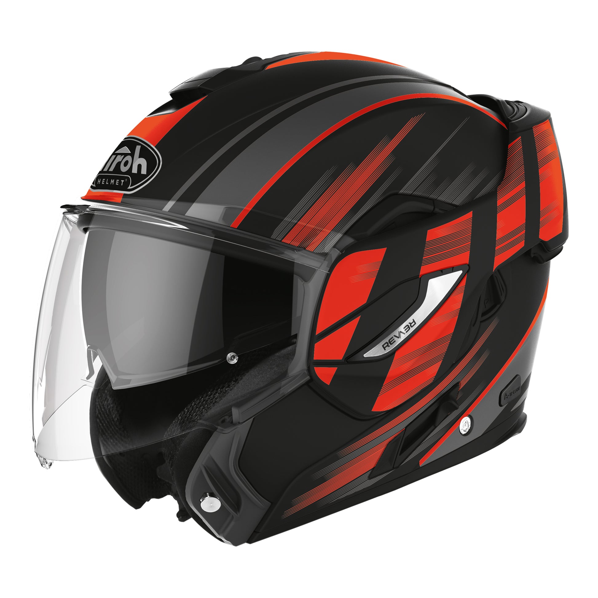 The Airoh REV19 Flip is a feature-packed flip-up helmet that combines full-face and open-face versatility in a dynamic and contemporary design - REV19 performs in all riding conditions delivering every safety and comfort requirement. The versatility of the REV19 marries the best aspects of both helmets by the patented 180 degree chin-guard rotation system (with double P/J certification) to simply and safely switch from full-face to open-face modes. Optimal vision is achieved by an extra-wide anti-fog visor for improved peripheral vision complete with Pinlock lens included, plus an integrated retractable sun-screen for sunny conditions. Maximum comfort is guaranteed by the "ACVS" (Airoh Combined Ventilation System), removable washable hypoallergenic liner and removable Stop-Wind to protect from wind and noise. Bluetooth communications can be simply installed via the dedicated wiring port. REV19 is the perfect road helmet for motorway, touring and urban riding.